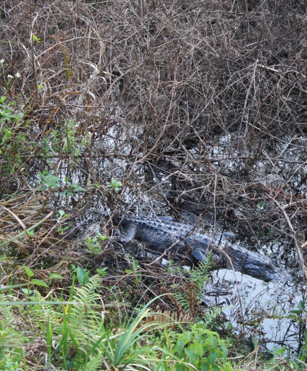 A gator along the path, relaxing after a snack.