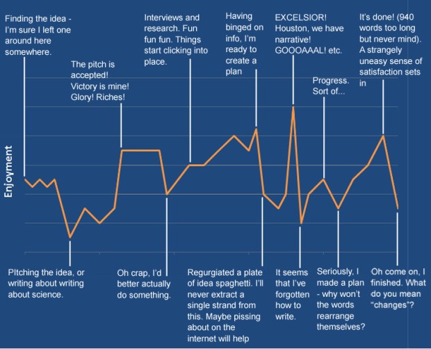 So to answer that question more fully (and because it’s been a bit of a slow week), here’s a graph depicting my process of writing a feature. Enjoyment’s on the vertical axis, time runs along the horizontal. This applies to longer features rather than blog posts – those are more straightforward and less emotionally variable.