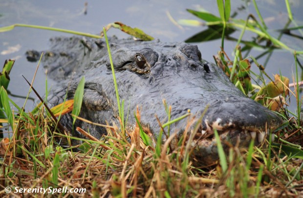 But in our efforts to find a spot in the Refuge with any crosswinds to blow the nasties away, we nearly stumbled upon this guy on the bank. He had just eaten, or was trying to catch the last rays of the day’s sun. I’m horrible with guesstimating measurements (15-footer?), but his head was as long as our torsos. Big baby. And a bit of a snaggle-tooth, at that — or perhaps he was simply an aged gentleman?