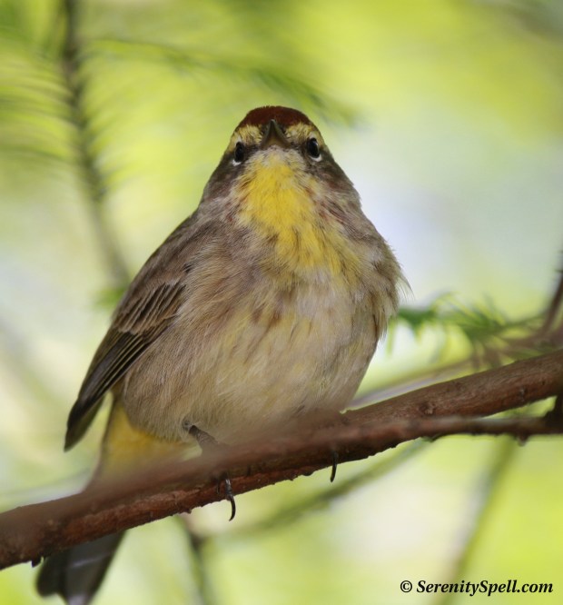 In honor of a family member who adores the small and colorful songbirds — and who’s been feeling under the weather, contending with hospitals and doctors and procedures, oh my — today’s post is brought to you by the *Yellow* Palm Warbler. We caught this little guy hiding amidst a strand of young cypress trees, in some protected wetlands. Many people are in such a rush — they’re on the phone, or otherwise scaring the wildlife — when they visit our natural spaces (WHY?), and they miss the tiny bright gems right in front of them.