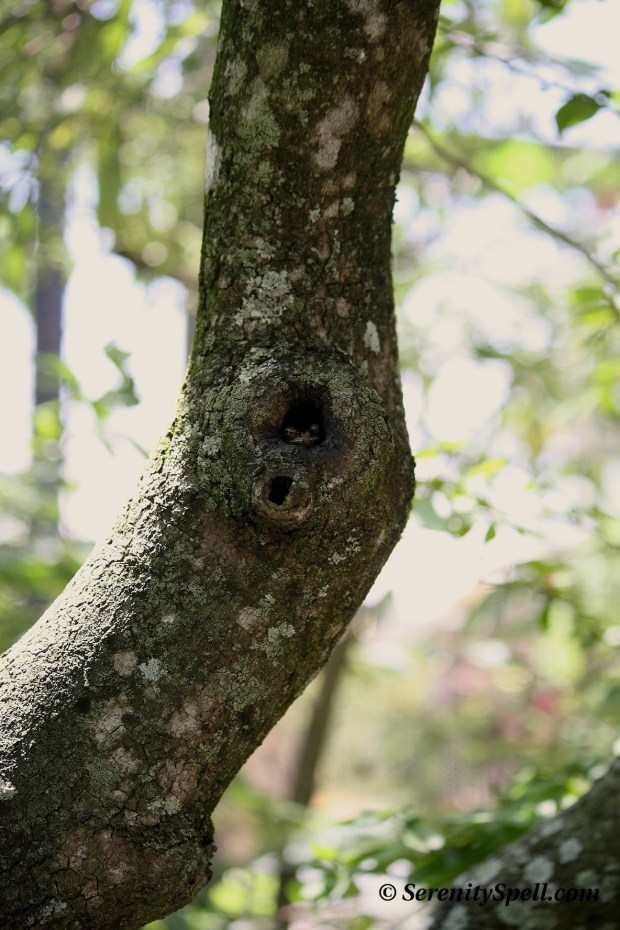 Isn’t it wonderful? Such a perfect home for him… I never even saw him in the knothole until I was literally face-to-frog eye with the tiny guy! I still have absolutely NO IDEA how my guy found him, and from that distance. It’s amazing how much life trees support. 🙂