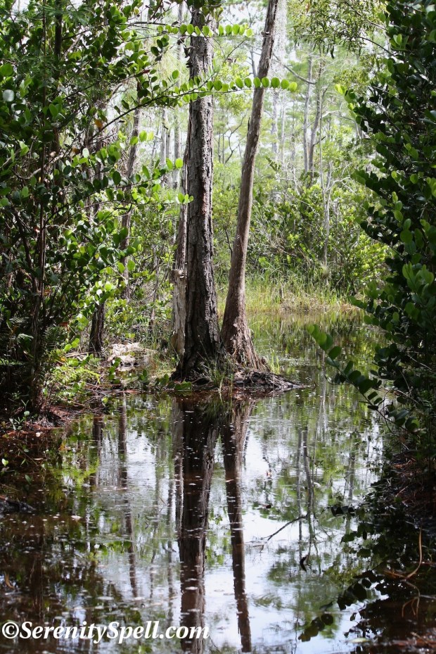 This was definitely one of those days — we needed to have our “senses put in order.” During the continued exploration of West Palm Beach’s Grassy Waters Preserve, we finally managed the entirety of the beautiful Apoxee Trail — “beyond tomorrow” in the Miccosukee language (pronounced A-po-hee). We also hiked part of the outer Owahee Trail, looping around to the Apoxee — where we spied the most amazing untouched cypress swamps and waterways. We previously weren’t (mentally) prepared for a flooded-trail hike, but on this day, we knew what to expect, so trusted our boots to do their stuff. Sadly, my sturdy pair lasted until the last half-mile…. Which, out of an entirety of 6 miles, was fairly frustrating. That’s when a startled OH! sounded from ahead on the trail, which one NEVER wants to hear while navigating waters that are the same height as the neighboring swamp / wetlands. Poisonous snakes swim down here. As do alligators. Ker-plunk goes my leg into the deepest section yet. No worries — there was so much beauty to be had, what’s a pair of soppy socks?