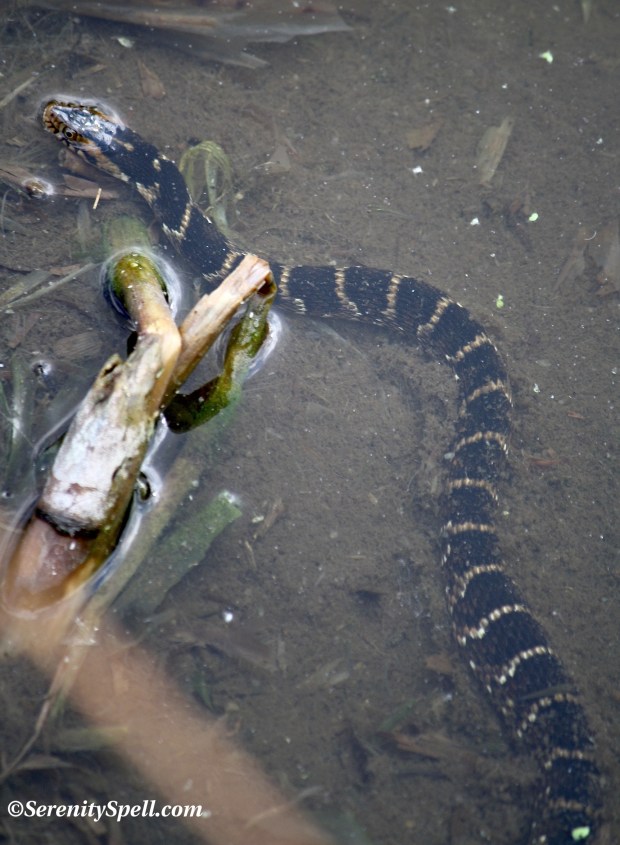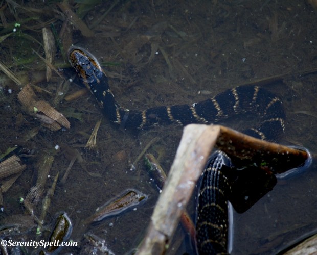 But fortunately, I didn’t see her; I saw water snakes during our last venture! This guy is a common water snake in our area — the Florida Banded Water Snake. They prefer freshwater habitats, and can be found in the shallow waters of wetlands, swamps, marshes, ponds, lakes, streams, and rivers. They’re native to the peninsula, and to the extremities of southeastern Georgia, and feed on live and dead fish and amphibians. Like other snakes, the Banded Water Snake plays a vital and significant role in our ecosystem. As predators, they feed on a variety of creatures, and can control the rodent populations. Snakes are also important prey for other species of predators. The presence or removal of snakes from any area affects the overall health of many ecosystems — and continued development threatens snakes’ survival.
