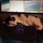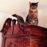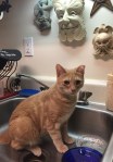 Another former feral / TNR rescue, now inside — Itty Bitty! (Note the tipped ear.) We have 5 inside guys, and all are former ferals, adopted at older ages. (Itty ran inside at 6 months, and never left!) It’s far from impossible, despite the old adage. We’re antiquarian booksellers — so here they’re doing their absolute best to help.