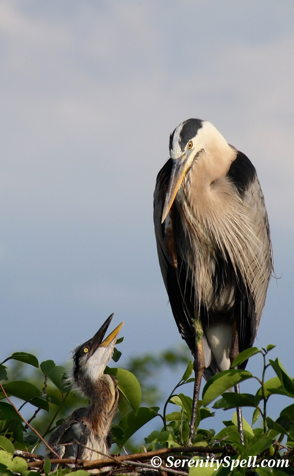 Great Blue Heron Mother and Her Growing Baby at the Nest