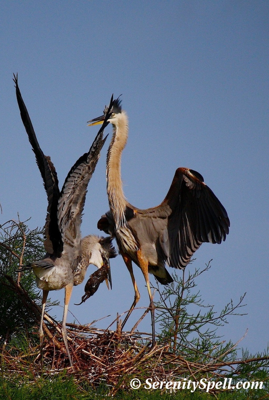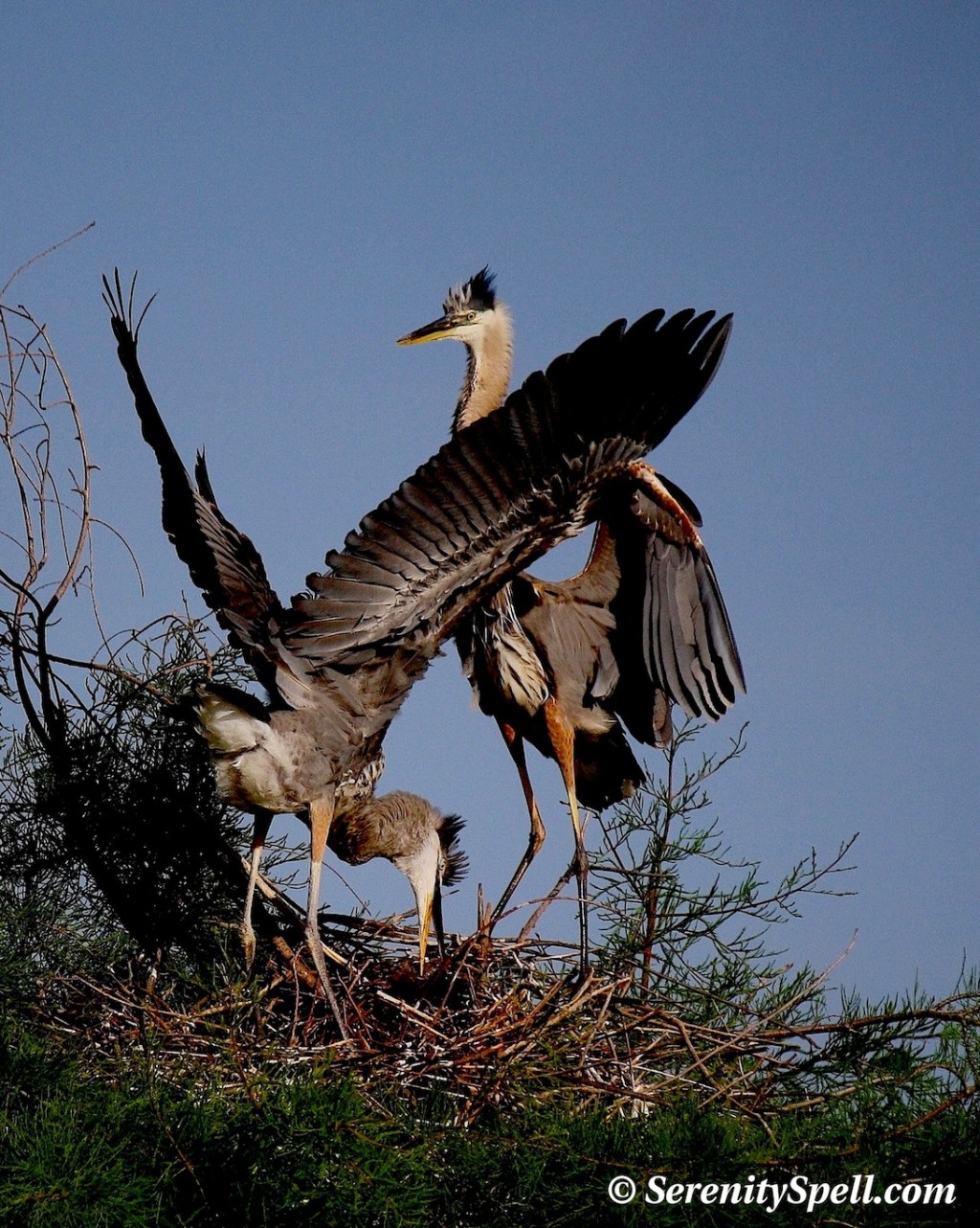 I had been watching one of the Great Blue Herons at our local wetland preserves a few weeks ago; she only had one baby, which is a bit unusual for the species. I watched as she built her nest high in the cypress trees, then dutifully guarded it, alone…. There was no male in sight, which is likewise unusual. Usually both the male and female remain at the nest, and hunt for the young. There aren’t as many human visitors at these particular wetlands, due to the lack of active rookeries — which suits me just fine; the baby alligators, birds, butterflies, marsh rabbits (or swamp bunnies as I’m fond to call them), and if I’m lucky, bobcats, keep me company.