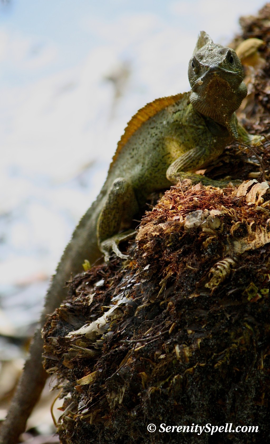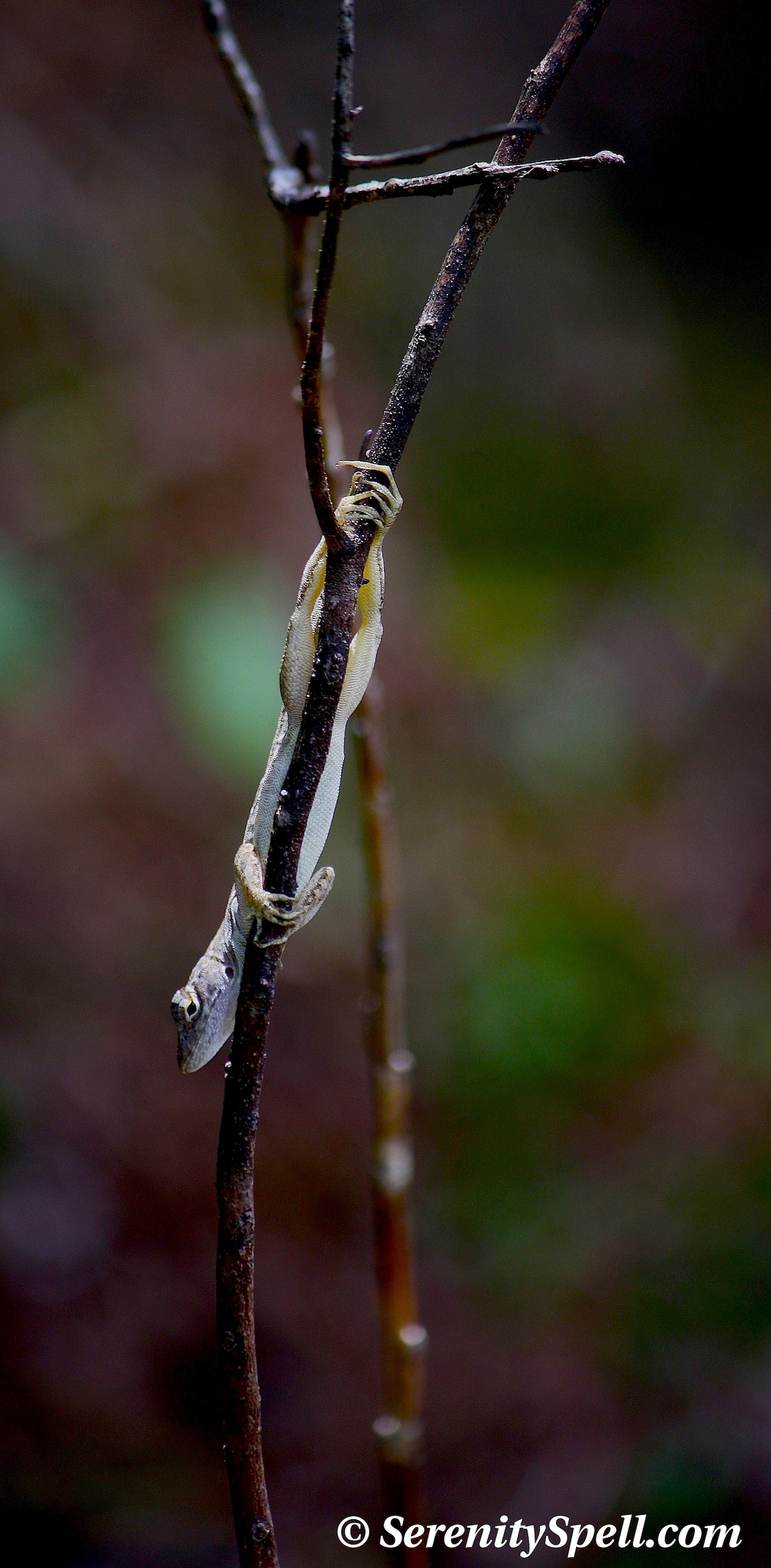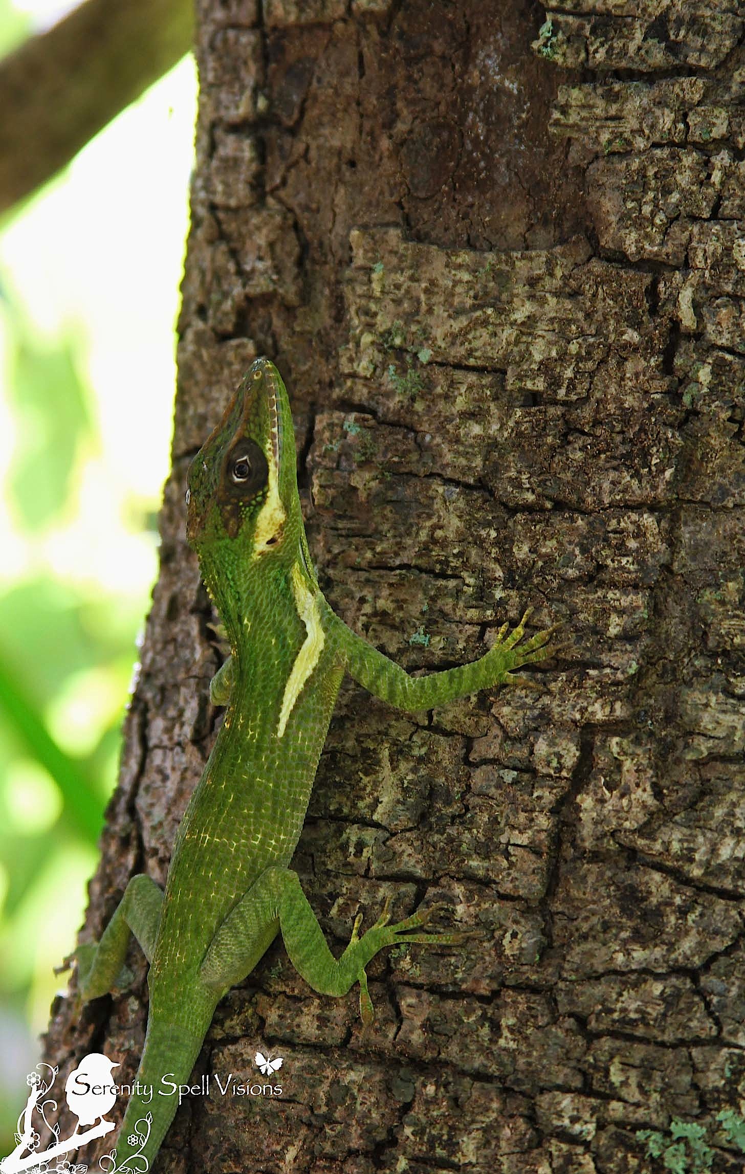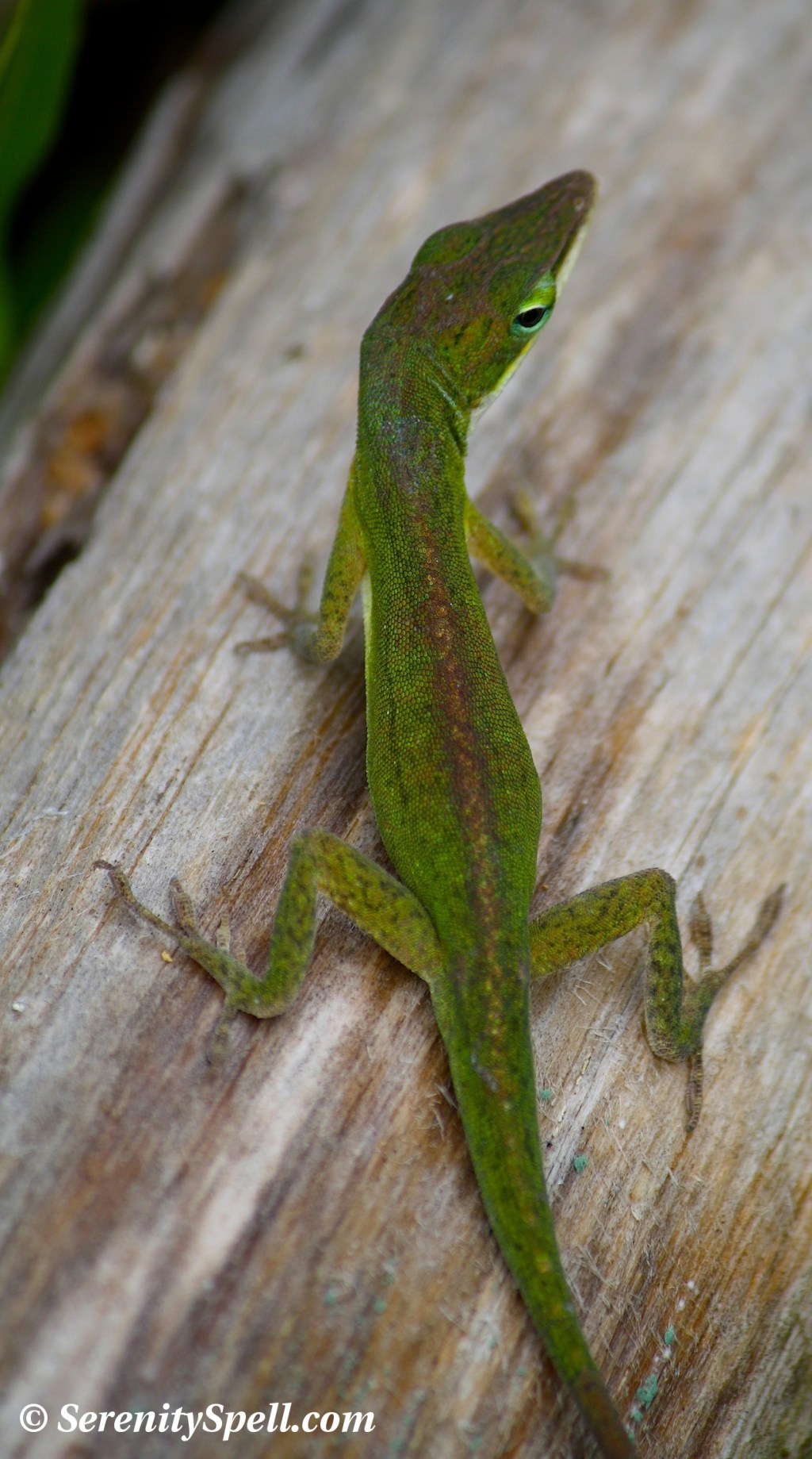 While getting some heavy pruning and weeding done before our approaching tropical storm, I was greeted by a bright green face amid one of our tree’s branches. Not a small guy, either — easily a foot-plus in length! At first, I thought he was a green anole…or a chameleon? I dropped everything, and ran with muddy shoes to fetch my camera to stalk him as he traveled through our trees.