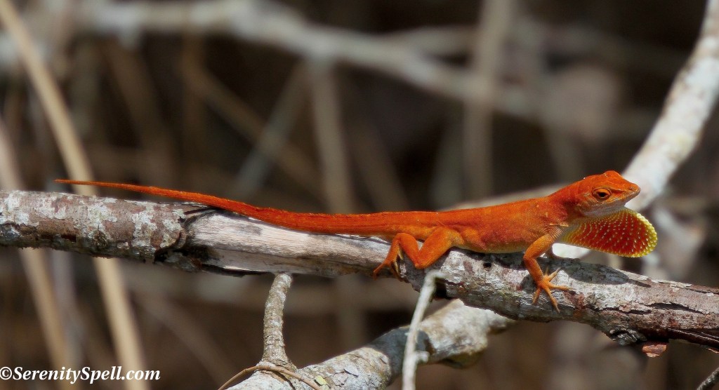 Upon further investigation, I now realize he’s a Knight anole, a non-native critter and the largest species of anole — growing up to 13-20 inches in length. Knight anoles are usually bright green, as seen here, but can change to brown colorations. They sport yellow or white stripes under the eyes and over the shoulder, and the tail is slightly serrated. Introduced from Cuba, they’re becoming increasingly common in South Florida, but will be unable to survive north Florida’s freezes. Most research shows proof of introduction in Dade and Broward, but they’ve obviously made it north, to Palm Beach county…. As further evidenced by our guy, these Knight anoles are at home in the higher shady canopies of trees, where they eat insects, other lizards, and even small birds and mammals. Sadly, many of the introduced non-native lizards are eating our native (and smaller) lizards.