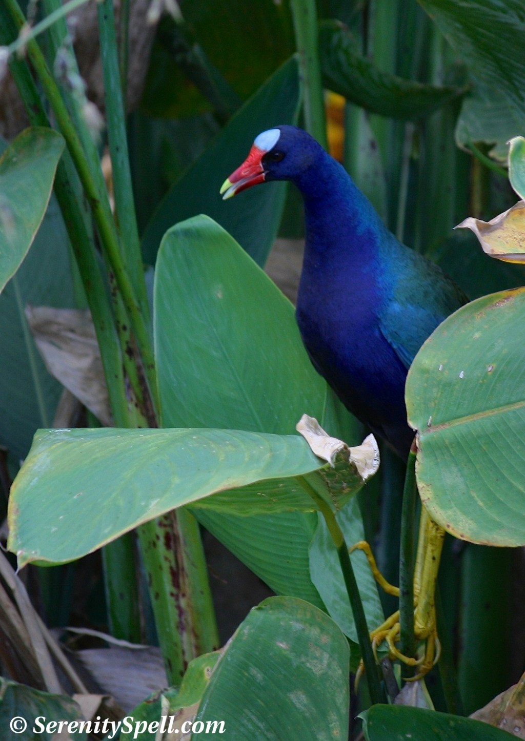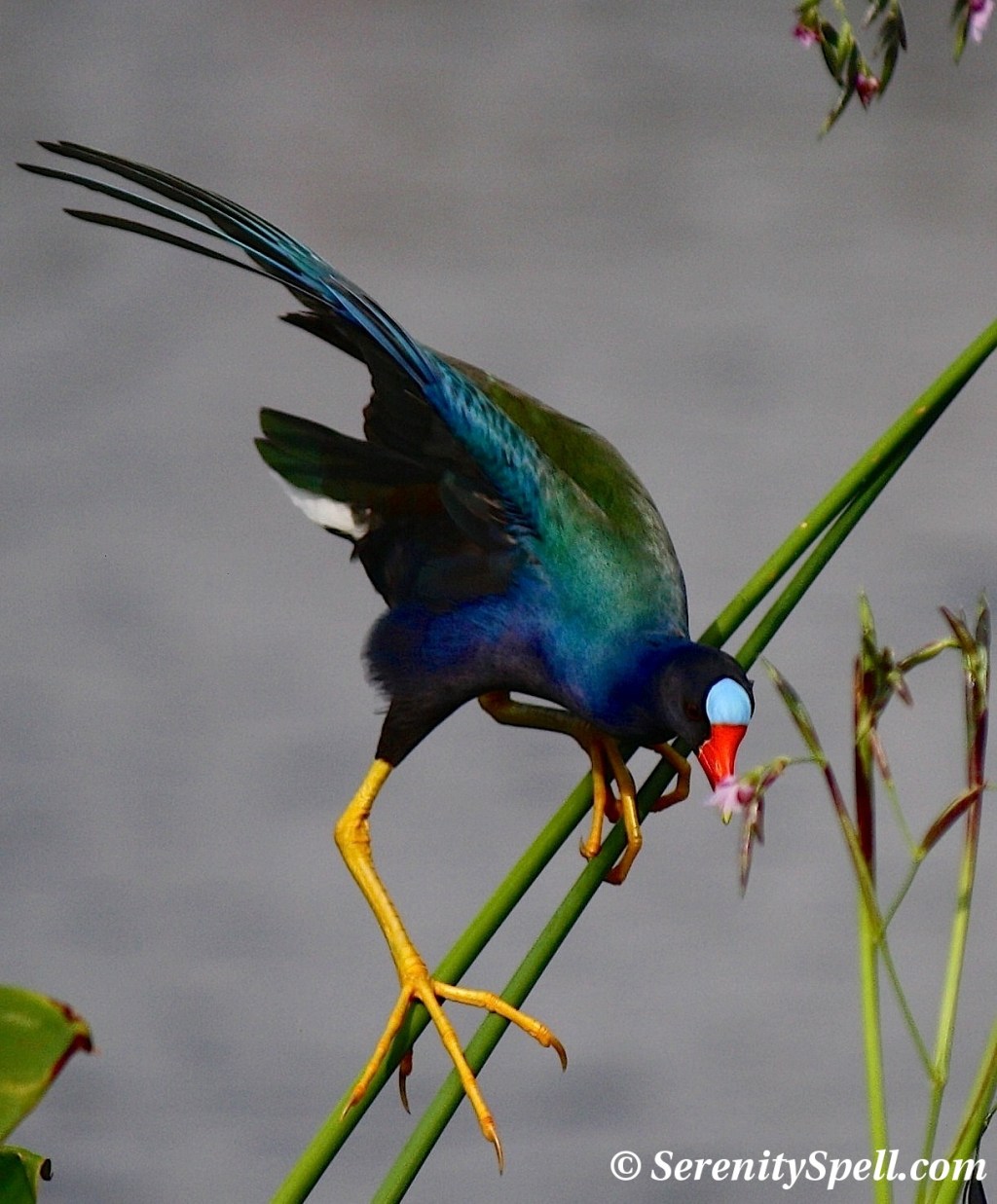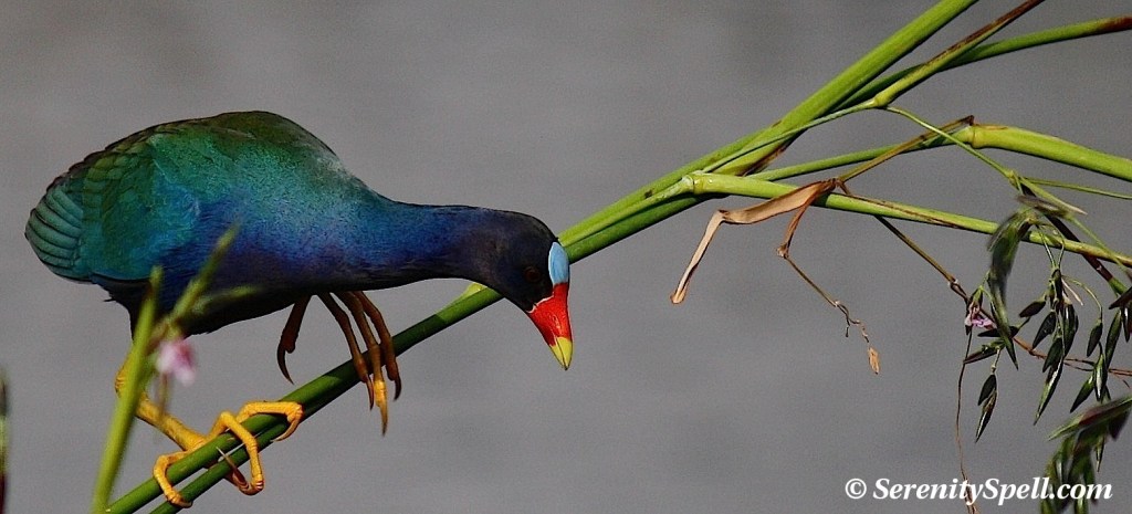 These lovely creatures live in the freshwater marshes of the southeastern United States, as well as in Central America and the Caribbean. There’s no mistaking this medium-sized rail, with its purple-blue plumage, green back, pale blue forehead, white undertail (of which I’ve caught more than one glimpse), bright red and yellow bill, and long yellow legs. The juveniles sport blander, brown colorations. The gallinules’ long legs make them *seemingly* awkward fliers, so short bursts of activity are their mode of transportation — or swimming like a duck if they’re not navigating the marsh with those dangling legs. They nest in well-hidden floating constructs in the wetlands, laying 5-10 eggs.