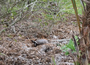 This poor guy was trapped behind acres of personal enclosure, and had been unsuccessfully attempting to burrow in the mulch — there were dozens of failed holes. We stayed awhile, seeing if he could escape on his own (or if he was choosing that location), but then saw how the fence was buried, impeding his escape. Between the buried fencing, his constant dodging, and the myriad failed burrows, we quickly relocated him to a perfect burrow-able location nearby — literally 10 feet away his natural habitat awaited him, for pete’s sake. Rule of thumb with turtles and tortoises, help them safely in the direction they’re trying to head. It would have been nice for the actual property owners to have done so, of course; it wasn’t difficult to see the poor guy’s quandary.